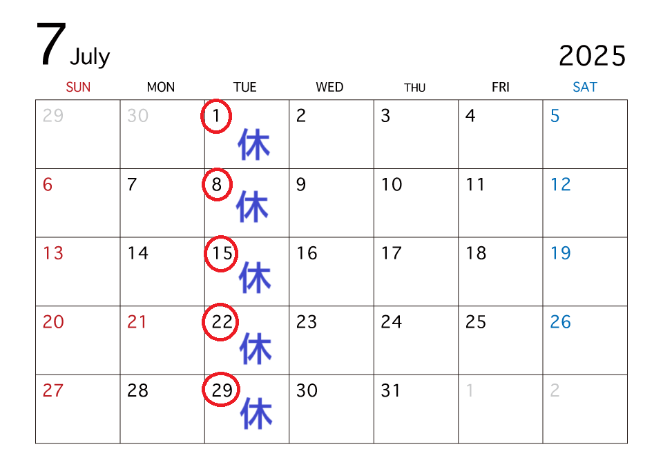 さて、遅くなりましたが7月の店休日は火曜定休のみとなっています。