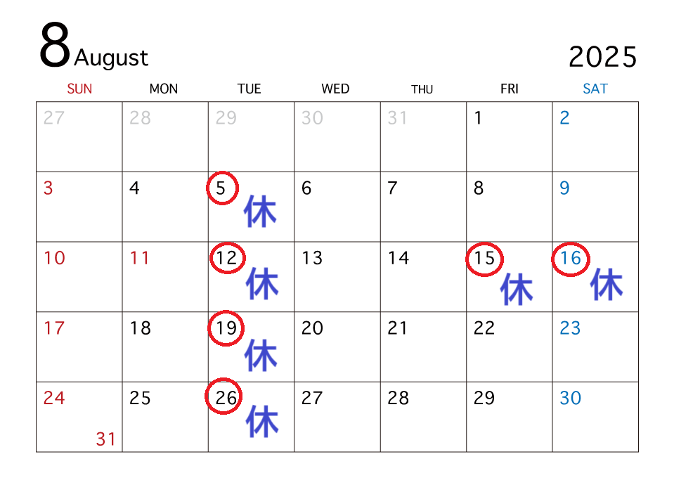 8月の店休日はカレンダーのように予定しております。ご来店の参考にどうぞ。