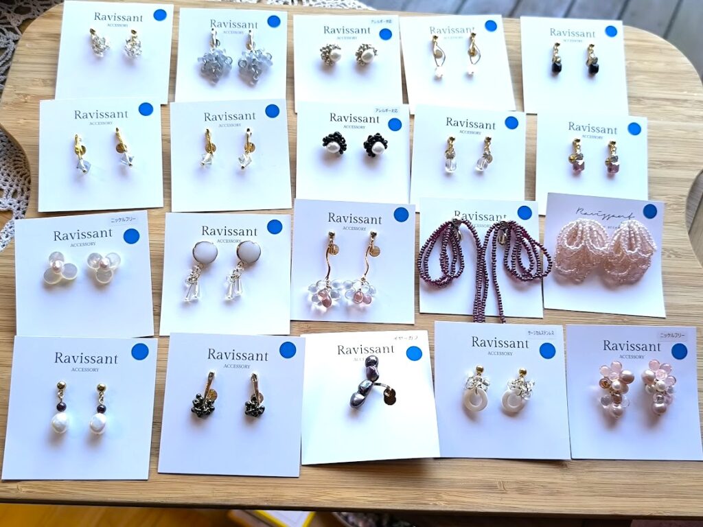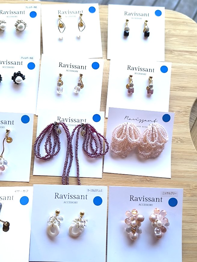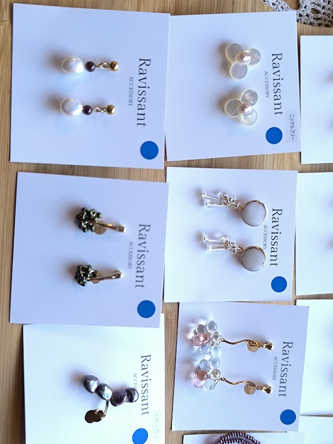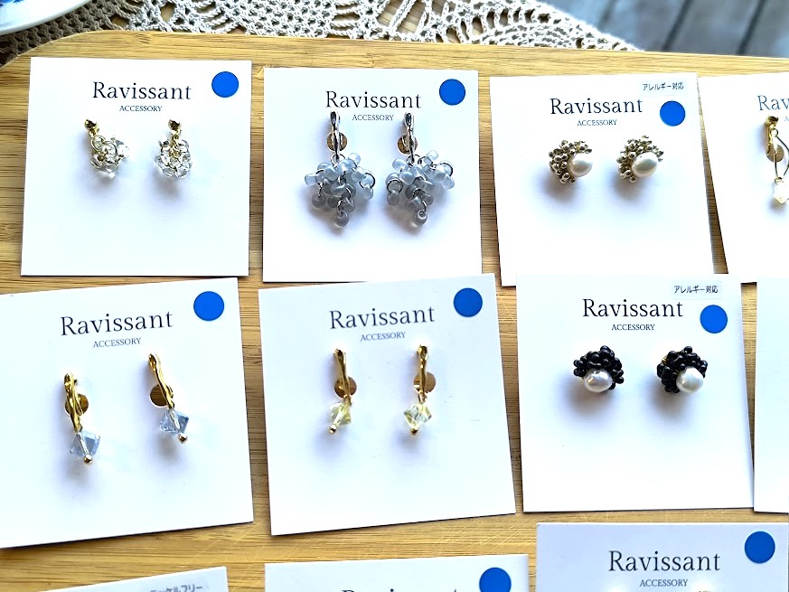 さて、当店では現在アクセサリー作家「Ravissant」さんの「Happy Set セール」を行っています。人気のイヤリングやピアスがよりどり2個セットで3,000円となっています。青丸の付いたシールがよりどり対象品です(下の写真を参考にどうぞ)